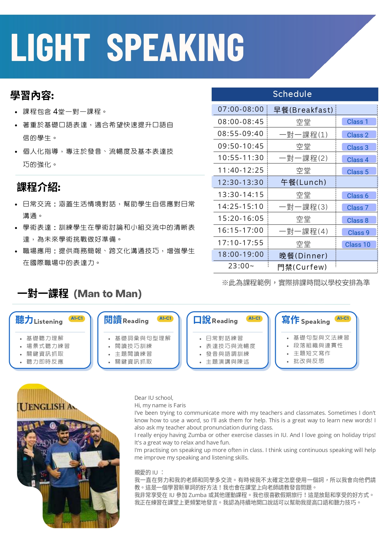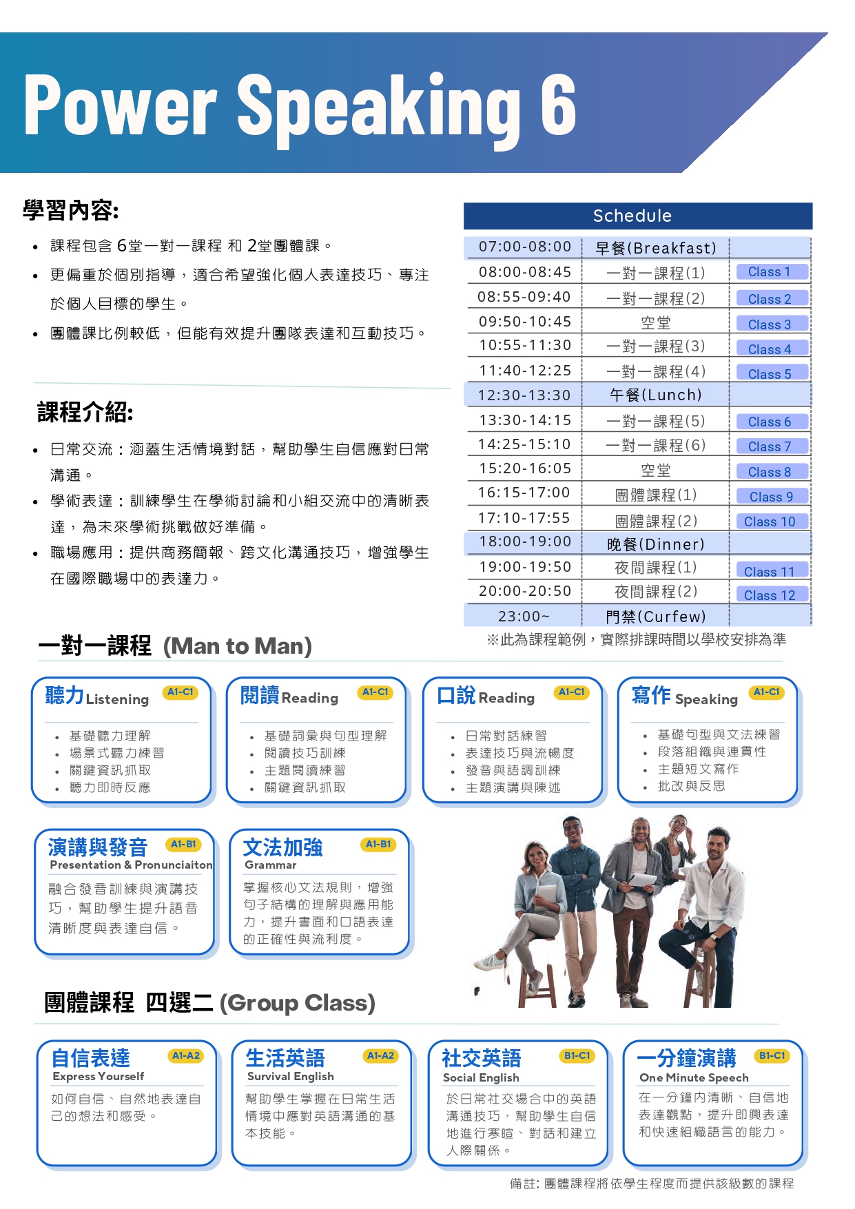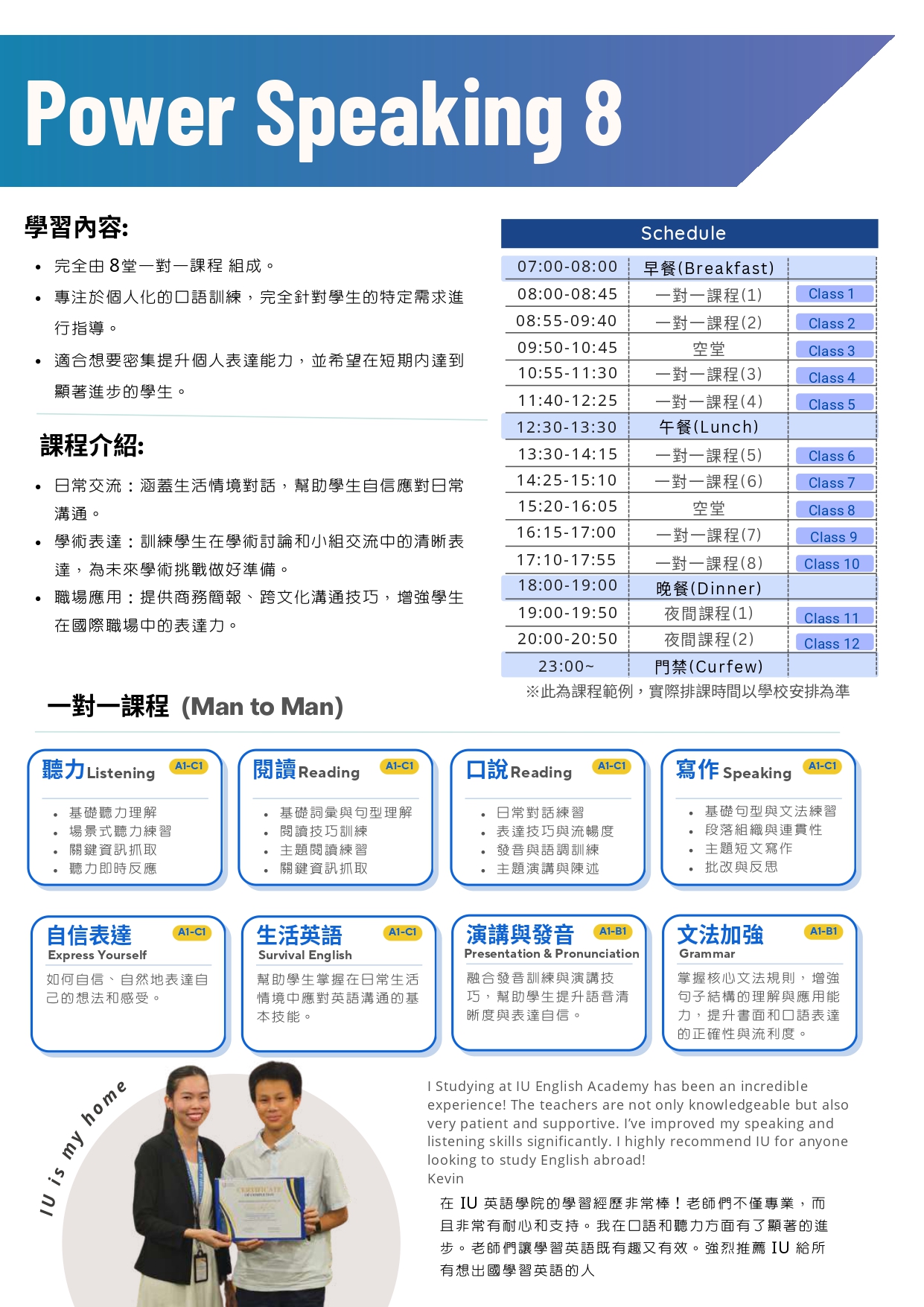 提供一對一課程和團體課程,每周模擬考試