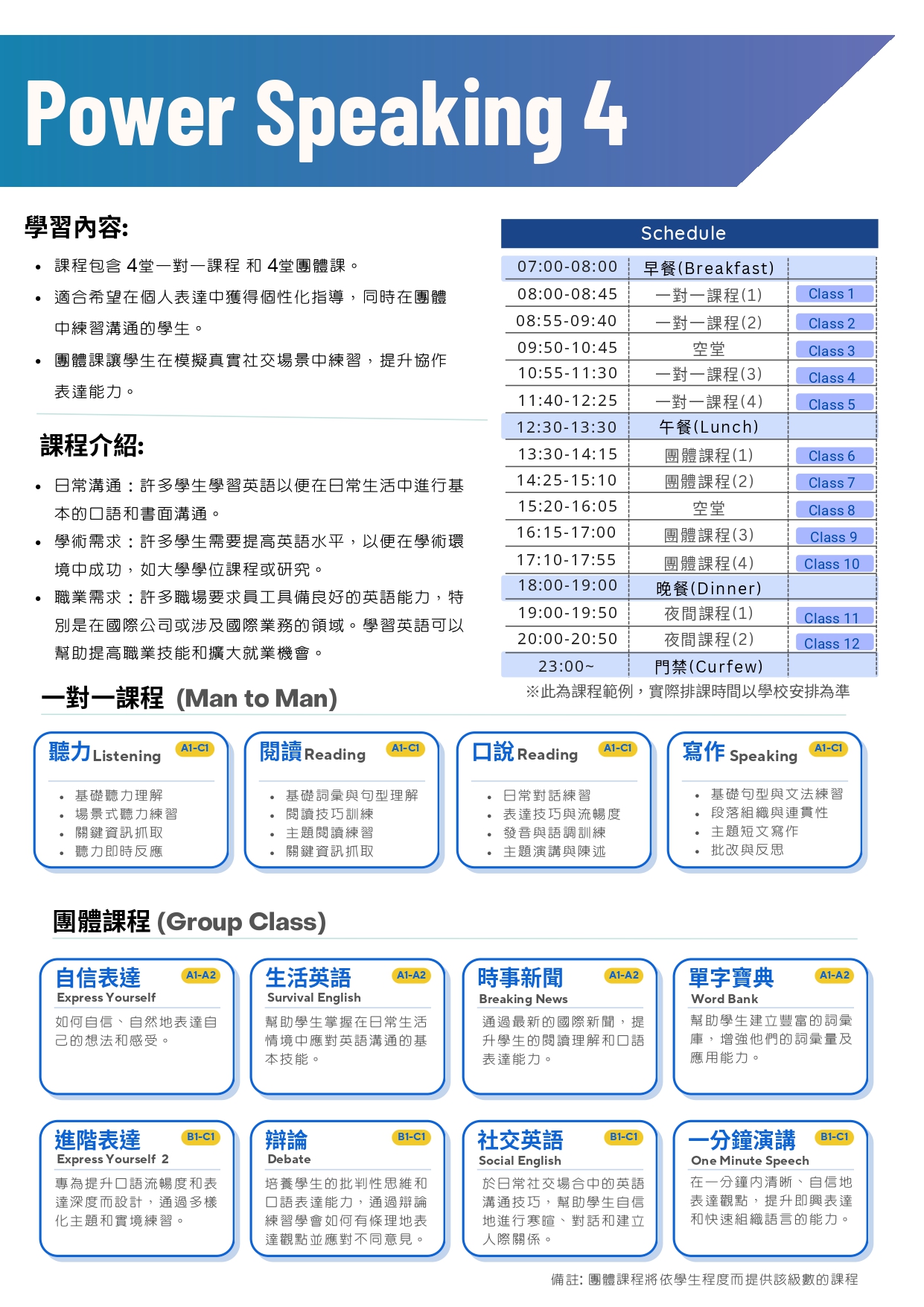 聽力、閱讀、寫作、口說、單字、文法等,旨在全面提升學生的英文能力。