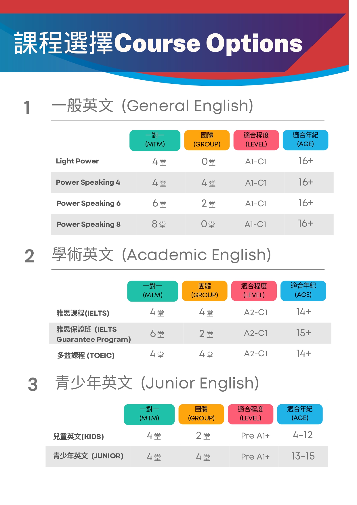 提供1:1 和1:8 的團體課程,依堂數區分